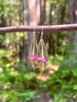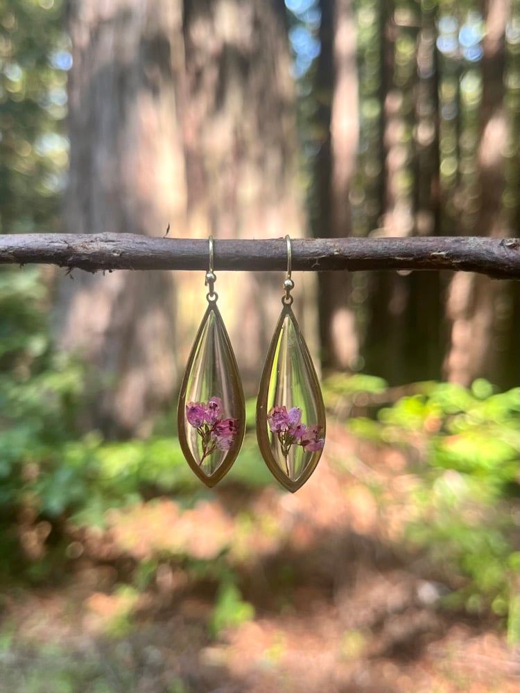 Natural heather plant, preserved in resin. Gold plated stainless steel hooks.