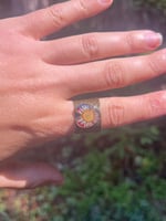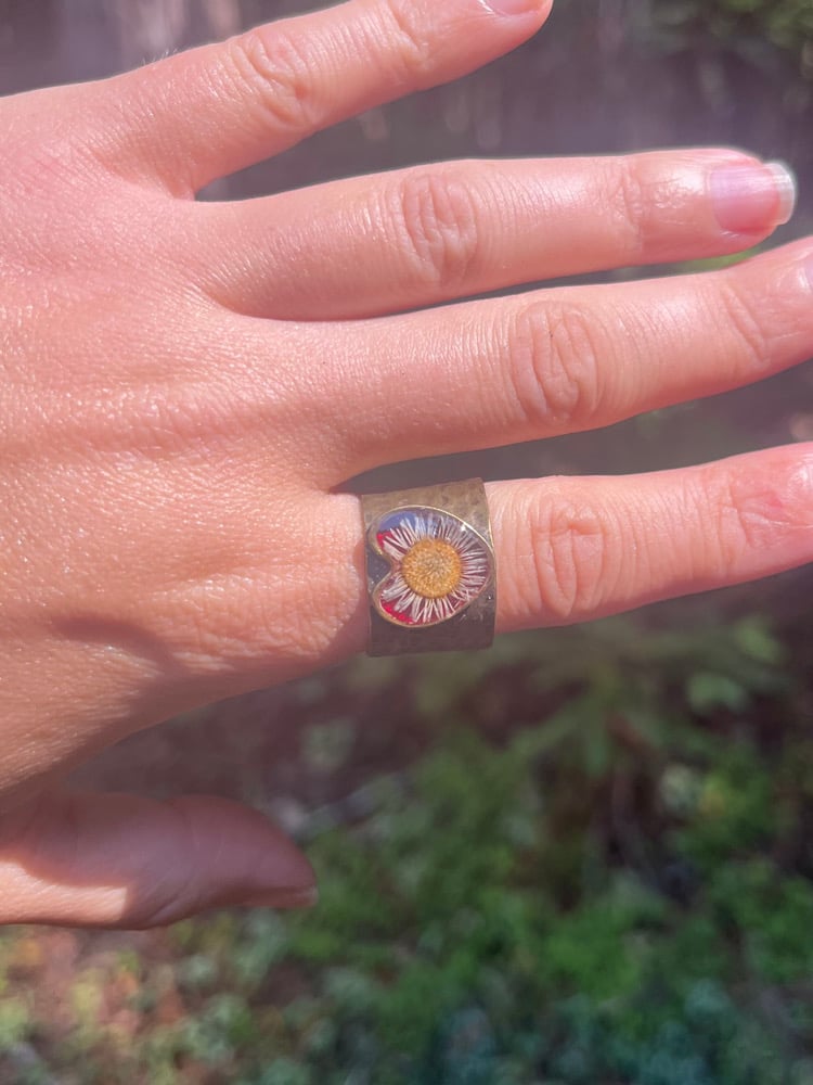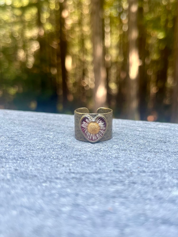 Natural fleabane flower preserved in resin. Bronze metal, adjustable open back.