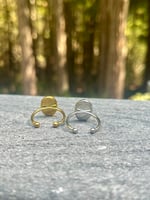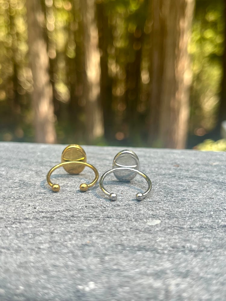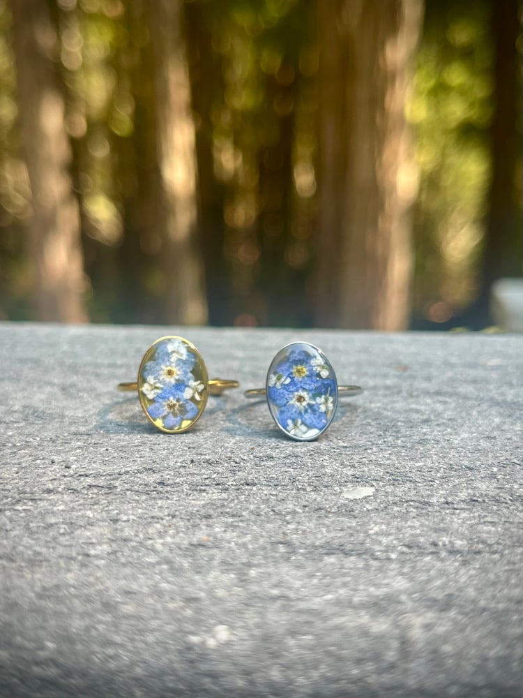 Natural Forget-Me-Not flowers, and Queen Anne’s Lace, preserved in resin. Choice of stainless steel,or gold plated steel metal. Adjustable, open back.