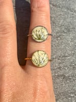 Natural Queen Anne’s Lace preserved in resin. Choice of stainless steel, or gold plated steel metal. Adjustable, open back.