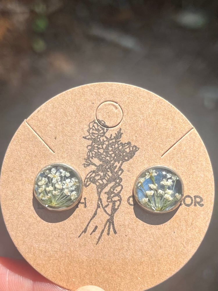 Natural Queen Anne’s Lace preserved in resin. Choice of stainless steel, or gold plated steel ear posts. Size 8mm.