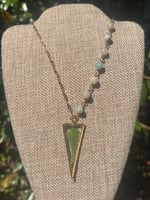 Natural fern preserved in resin. Gold plated stainless steel paper clip chain, genuine amazonite beads, creating a asymmetrical style. Measures about 18 inches. The amazonite beads will vary in color, may not be 100% identical to photo.