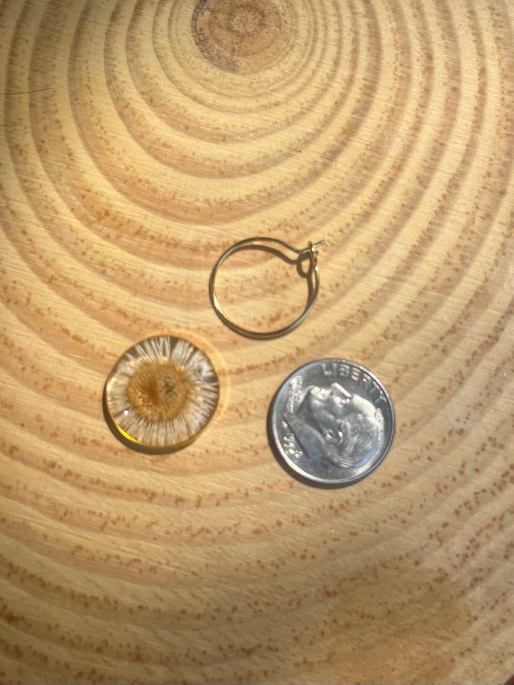 Natural fleabane flowers preserved in resin. Choice of stainless steel or gold plated steel. 15mm hoops.