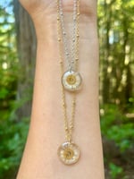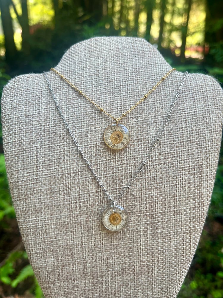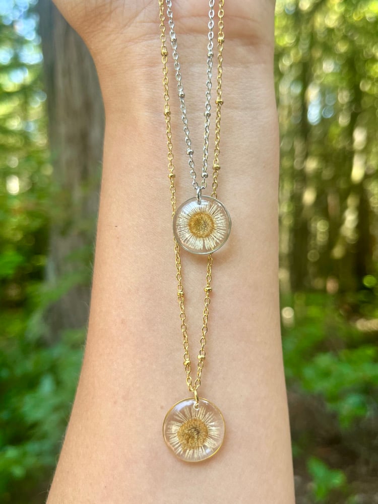 Natural fleabane flower preserved in resin. Choice of stainless steel, or gold plated steel. Satellite chain measures about 18 inches.