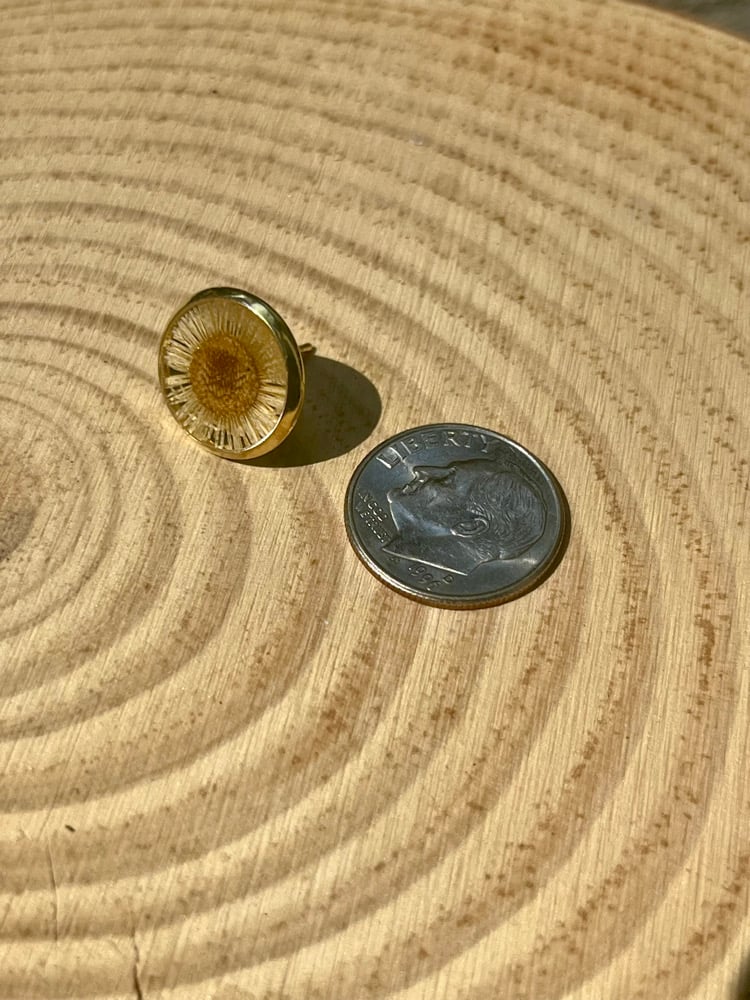 Natural fleabane flowers preserved in resin. Choice of Stainless Steel, or gold plated steel ear posts. Size 10mm.