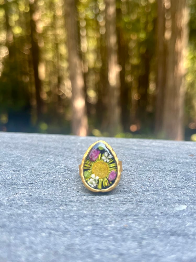 Natural pressed flowers preserved in resin. Gold plated brass metal, adjustable open back.